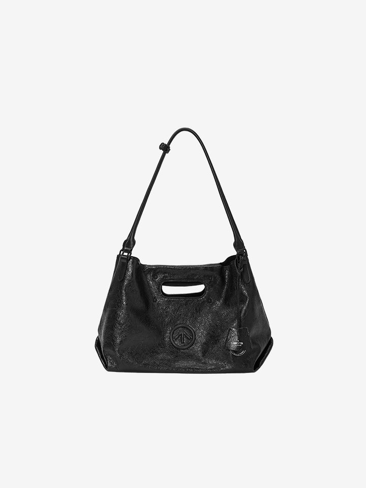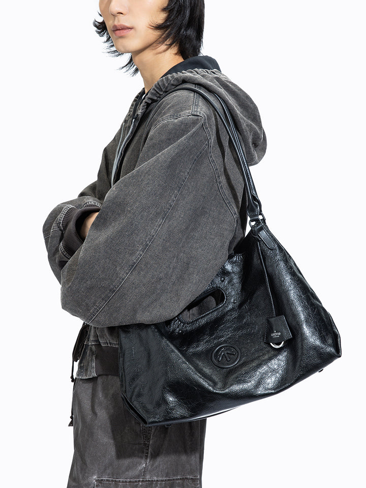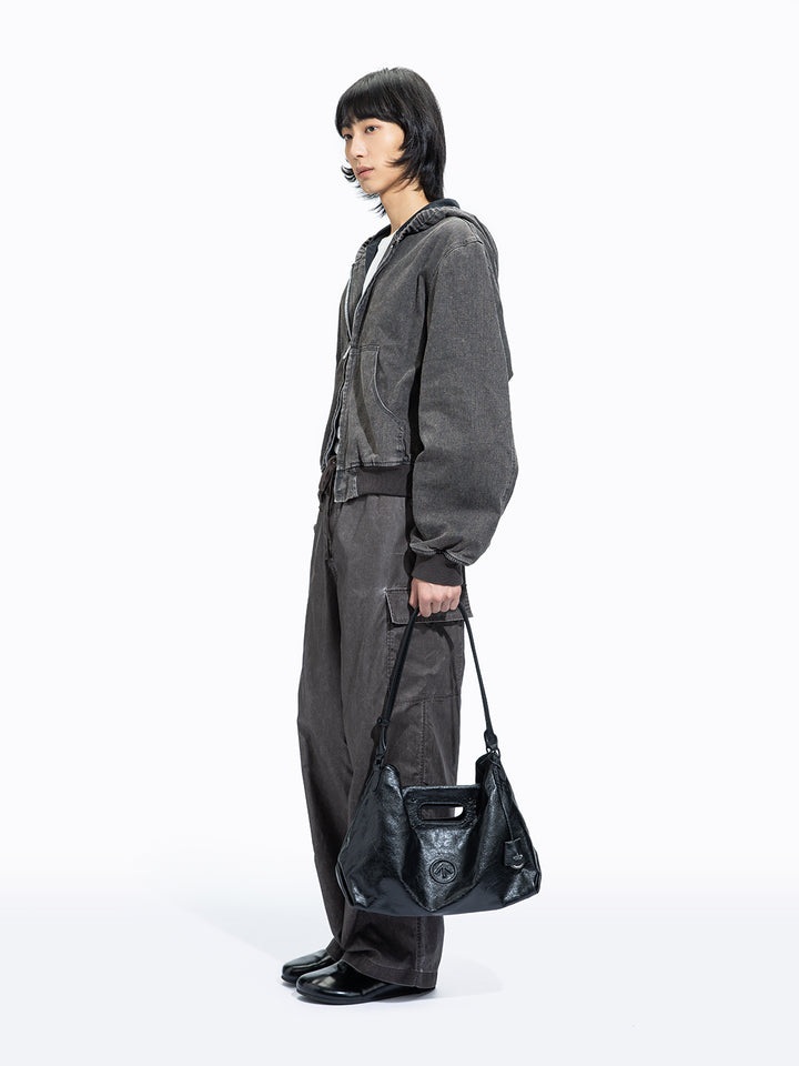 这款大容量手提包的设计灵感源自 20 世纪 60 年代嬉皮士运动的精神。 这款托特包采用简约廓形和柔软的复古纹理皮革,勾勒出轻松休闲的轮廓,同时融入了品牌经典的结构元素。这种组合展现出一种毫不费力的轻松感,又带有一丝不羁的个性。